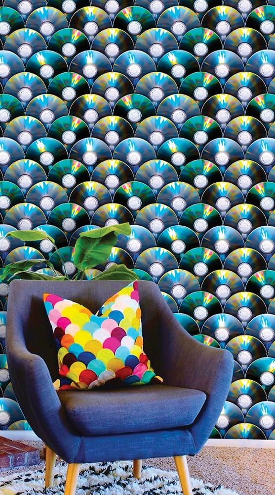 Этот необычный паттерн затронет сердца меломанов. Такие обои скажут все за вас. Выложенные чешуйкой компакт-диски придадут интерьеру яркости, характера, и, главное, концептуальности. Выделите ими творческую зону или украсьте стены гостиной, и ваша душа запоет, а дом - заиграет.