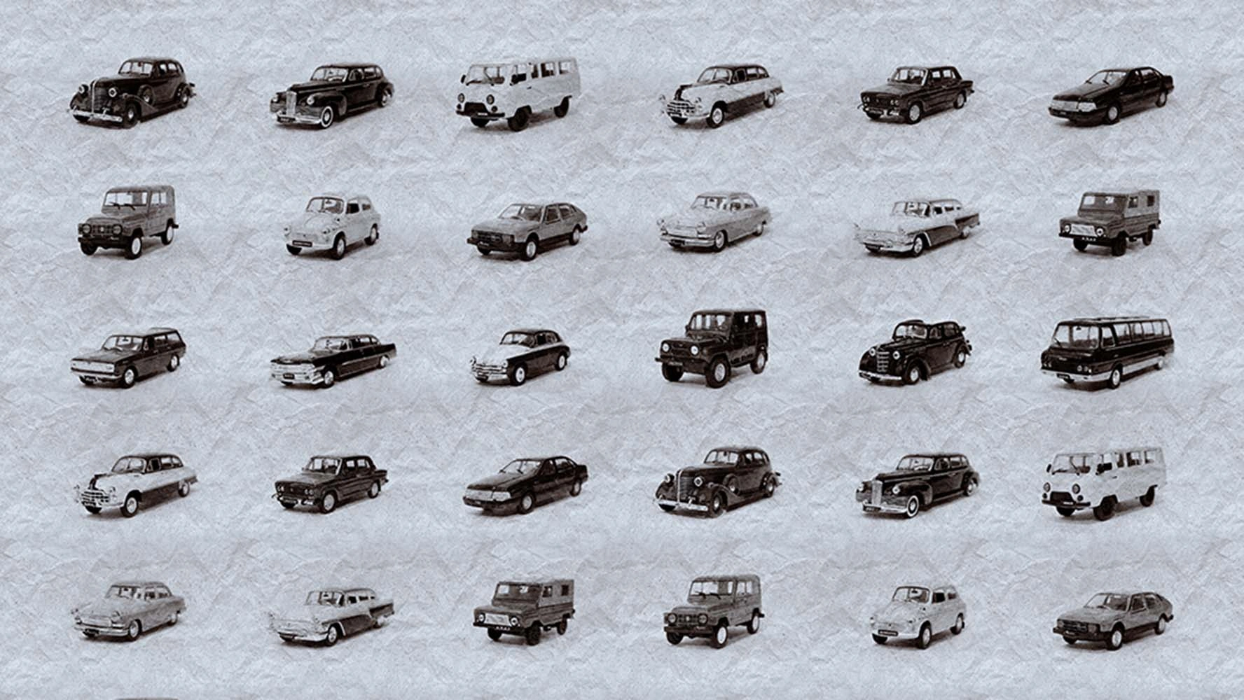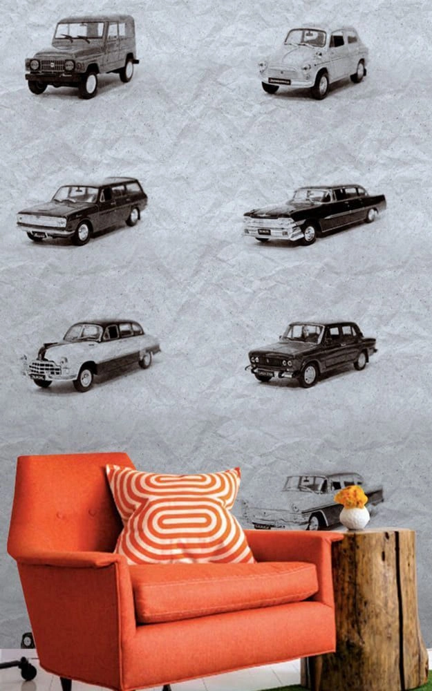 Обои Retro cars - настоящая выставка винтажных автомобилей. Старые модели Волги, ЗИЛа, Москвича и многие другие наполнят интерьер особой атмосферой советских времен.