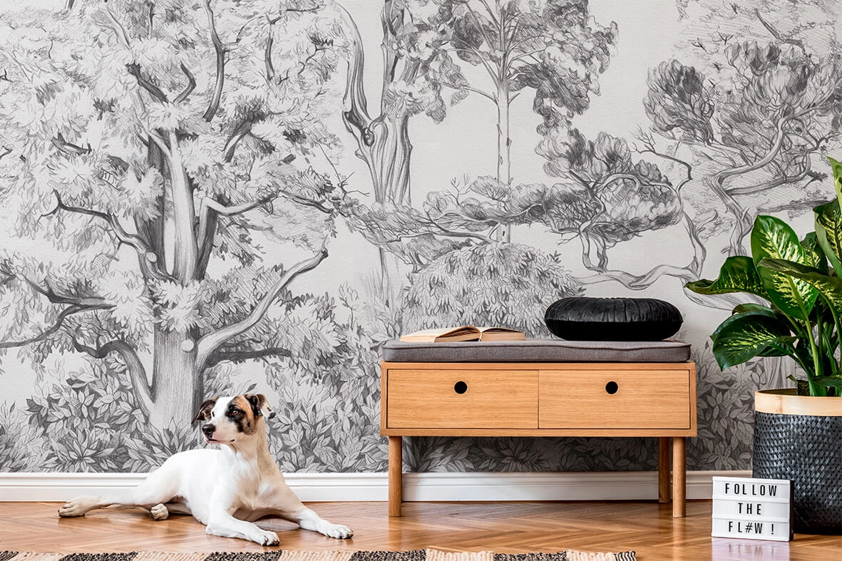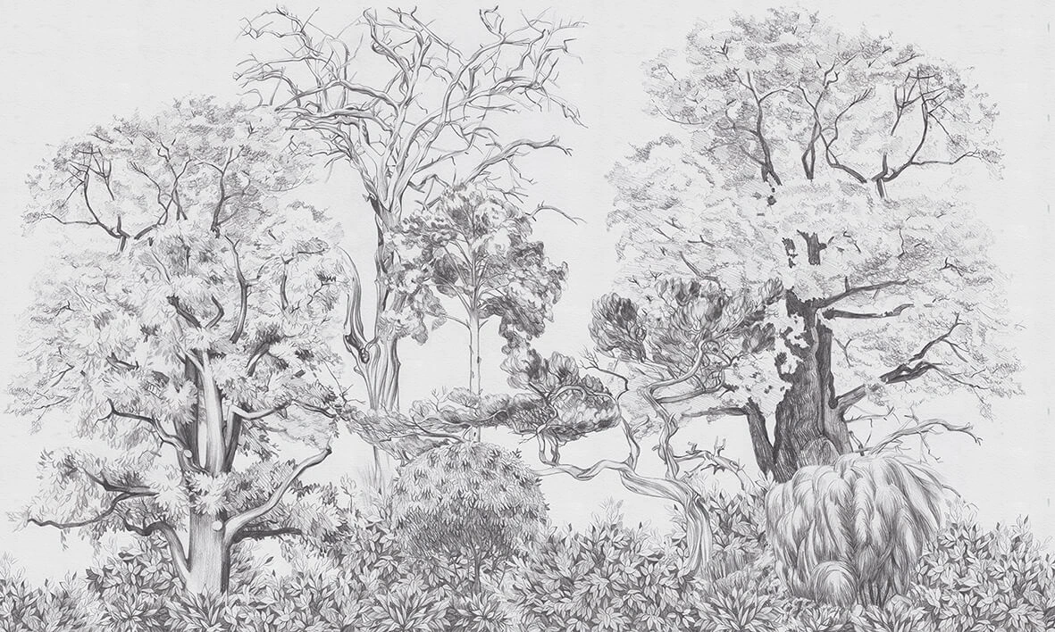Изображение сада с густой растительностью, среди которой есть молодая зелень и многовековые деревья. Монохромный принт может стать основой многих стилистических решений. Лёгкий и приятный.