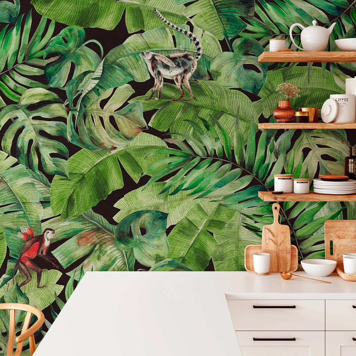 Дикие джунгли и экзотические животные на тёмном фоне – прекрасное решение для помещения, чей владелец ценит натуральные материалы в интерьере, стиль и комфорт. Глубокий зелёный умиротворяет и способствует восстановлению сил, что просто необходимо в условиях мегаполиса.