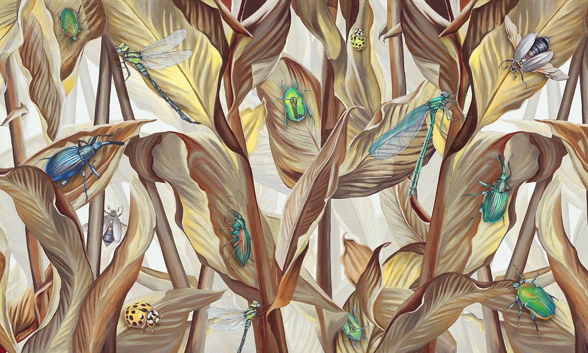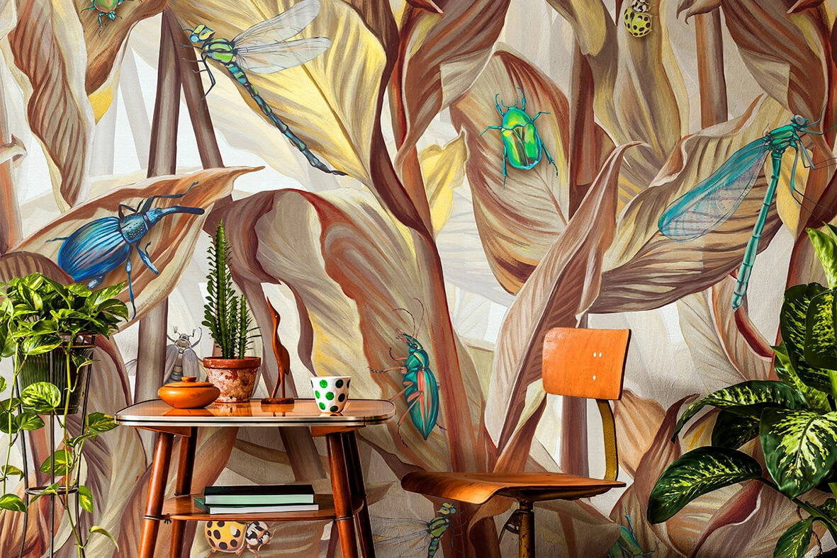 Принт с изображением растений и насекомых выполнен в тёплых оттенках коричневого с использованием ярких акцентов. Такие обои создают ощущение комфорта, уюта и взаимосвязи с природой.