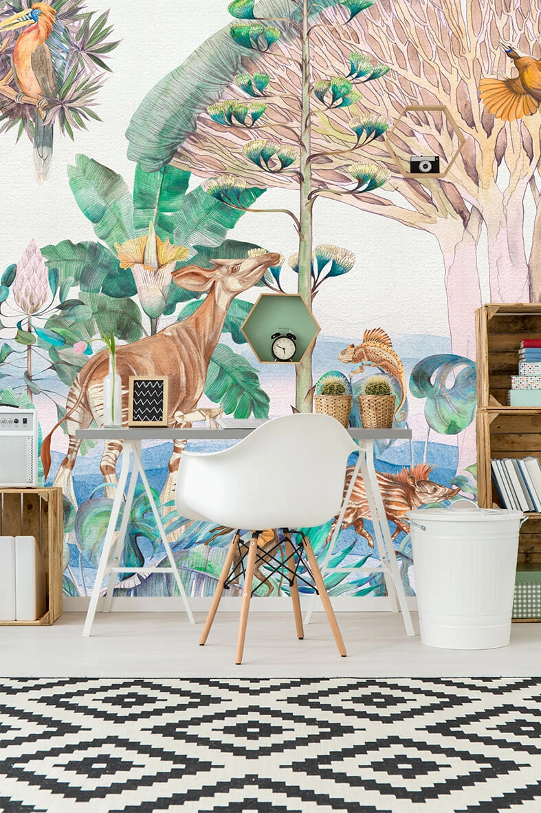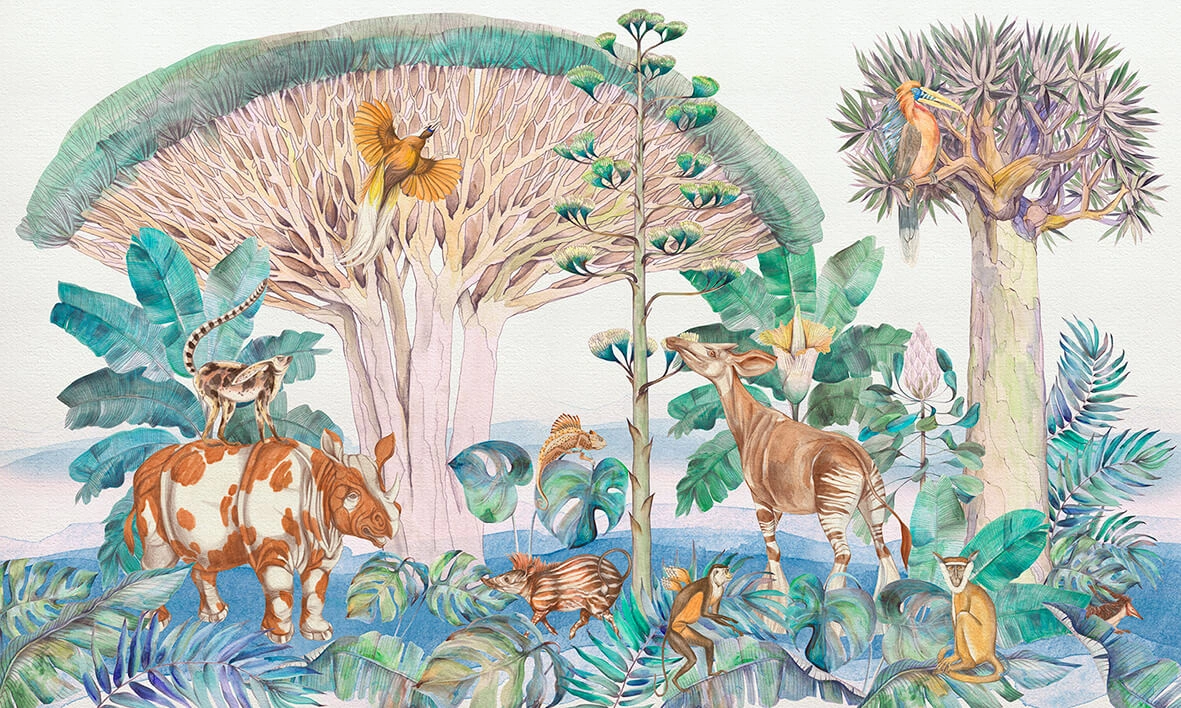Принт с изображением дивного сада и экзотических животных. Рисунок выполнен в приятной сине-зелёной цветовой гамме с использованием тёплых оттенков. Светлый фон дарит ощущение воздуха и лёгкости. Необычные обои для интерьера творческой личности.