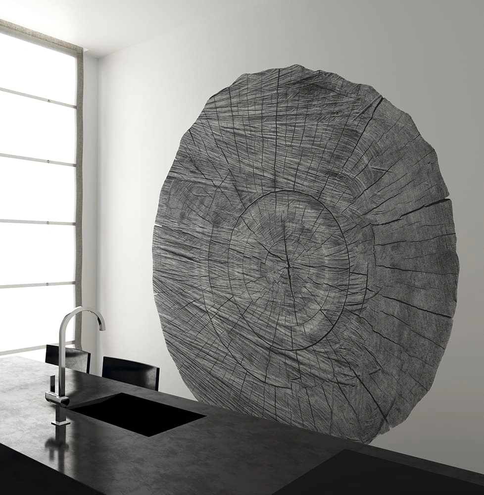 Уникальный природный рисунок деревянного спила особенно выразительно смотрится на контрасте с гладкими современными поверхностями.