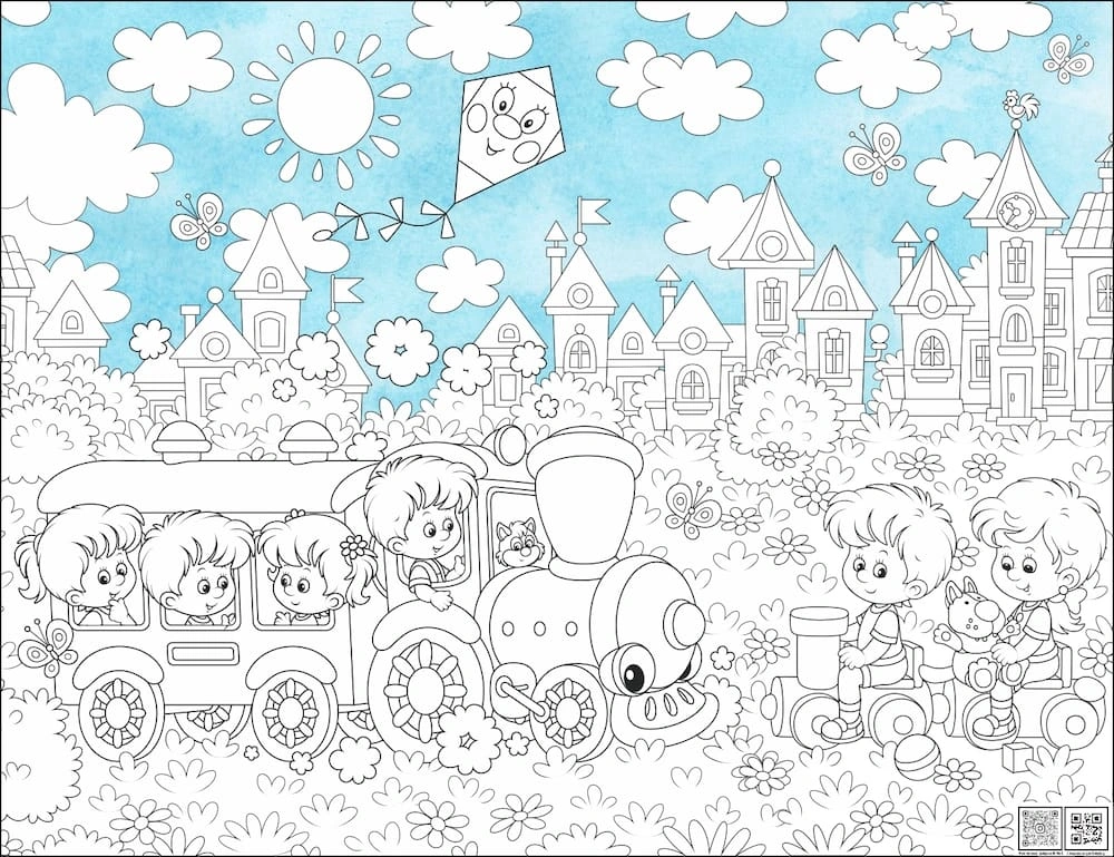 Весёлый летний сюжет и путешествие на паровозике. Раскраска с забавными персонажами имеет готовый цветной фон. Подходит для детей дошкольного и младшего школьного возраста. Развивает воображение и готовит руку к письму.