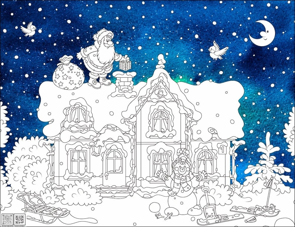 Раскраска, изображающая волшебство Новогодней ночи. Малышу непременно понравится такой сюжет, а готовый цветной фон облегчит задачу. Процесс раскрашивания развивает воображение и готовит руку к письму.