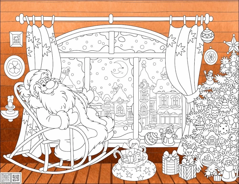 А как Дедушка Мороз проводит новогодние каникулы? Предложите малышу пофантазировать на эту тему, а заодно раскрасить эту картинку. Здесь уже есть готовый цветной фон, что облегчает задачу ребёнку. Процесс раскрашивания позволяет весело и с пользой провести время.