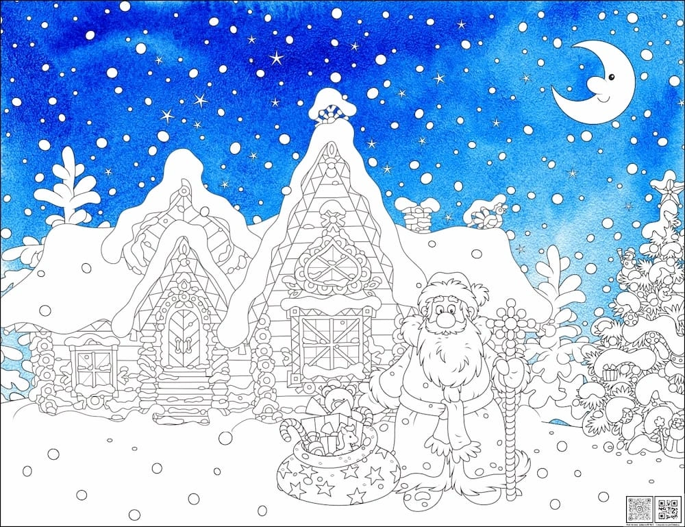 Кажется, Дед Мороз уже собирается в путь, чтоб принести ребятам подарки. Вместе ребёнком пофантазируйте на эту тему, а заодно раскрасьте картинку. В помощь малышу эта раскраска имеет готовый цветной фон.
