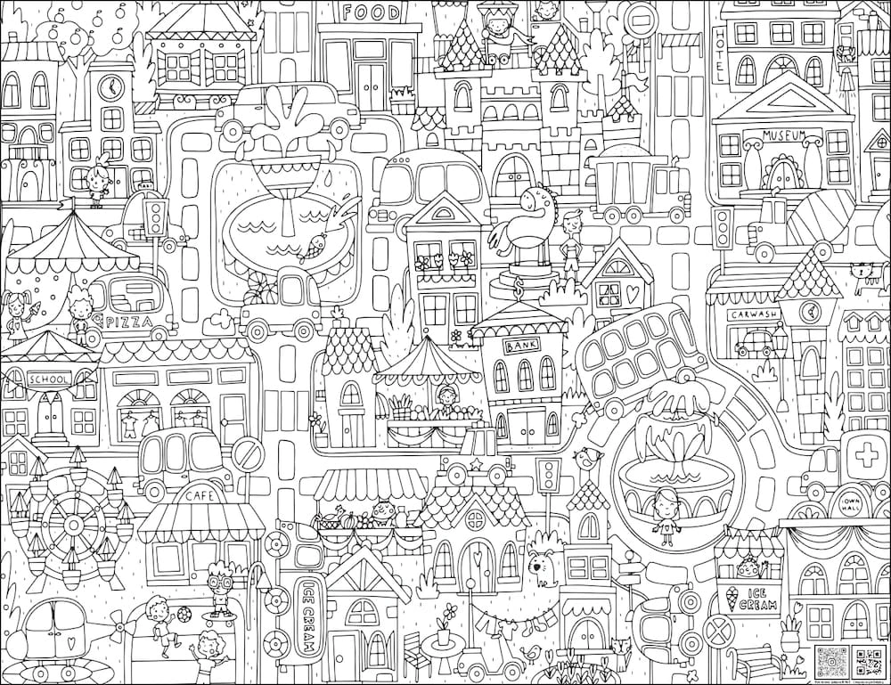 Забавный город, населённый удивительными персонажами. Здесь так много мелких деталей, что, разглядывая картинку, можно постоянно находить что-то новое. Процесс надолго увлечёт и детей, и взрослых.